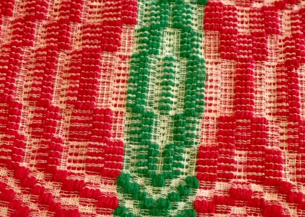 Woolen weave in multi color loom pattern. Design is of Stefani, or wreaths. 90 years.