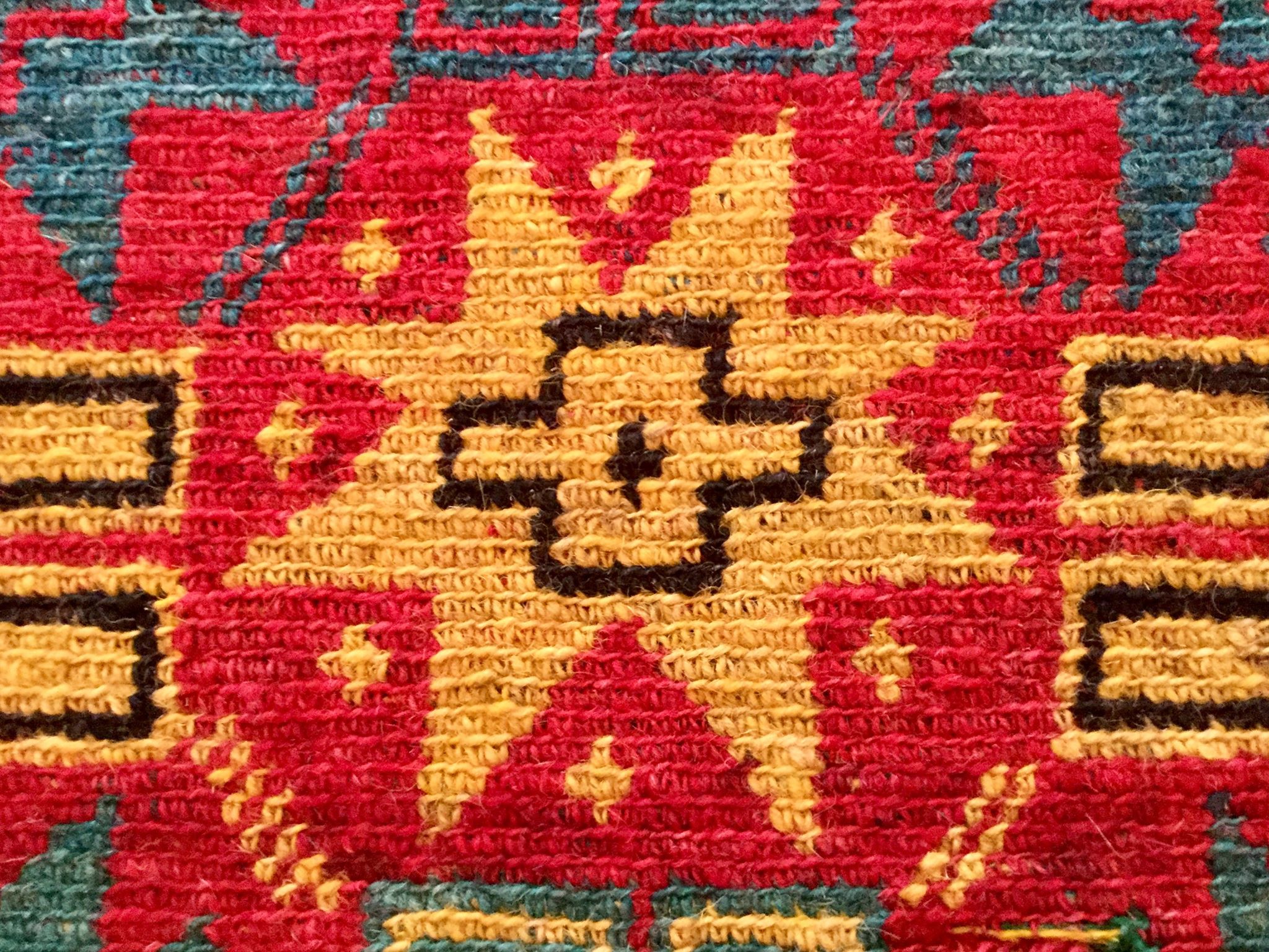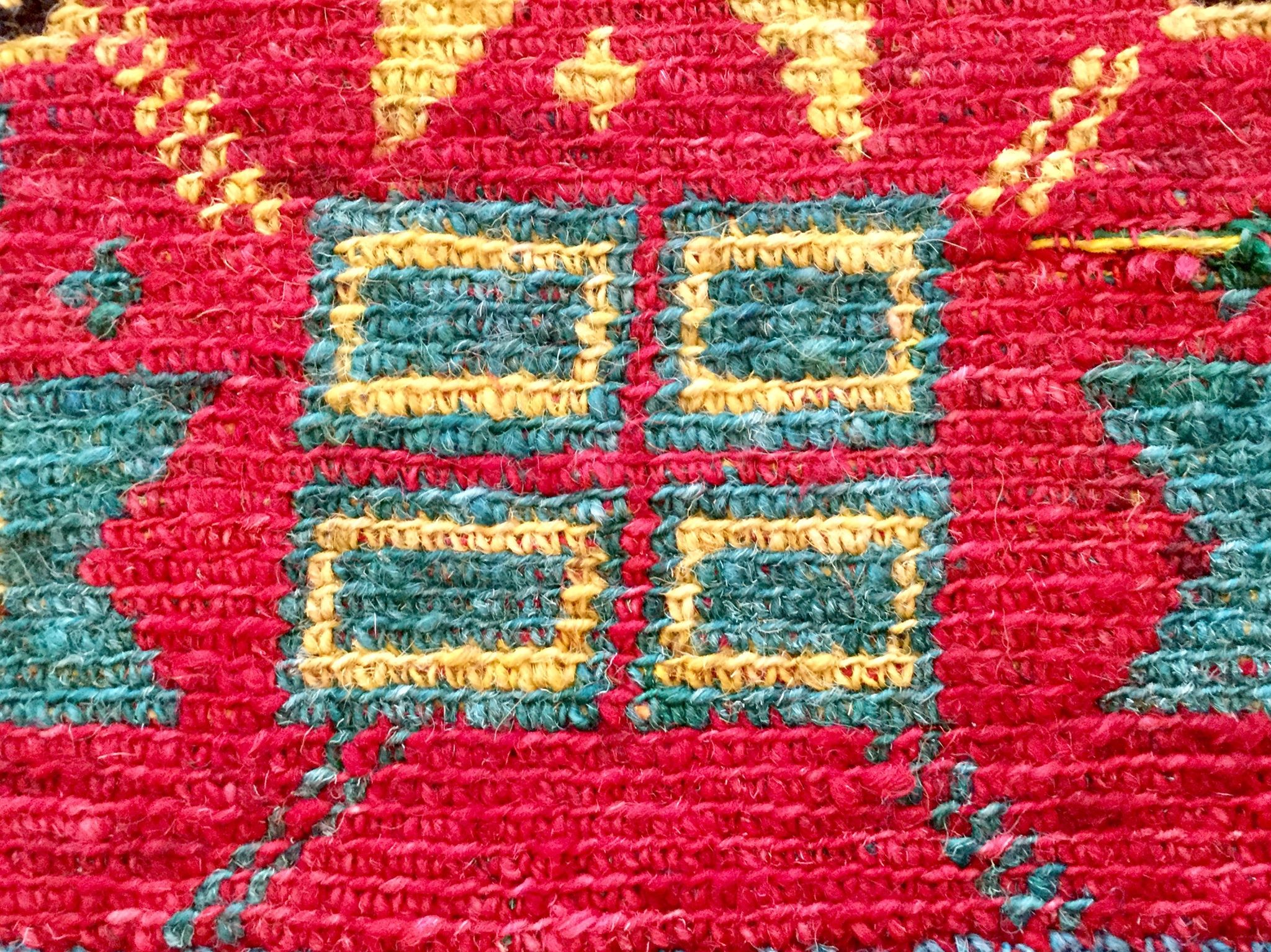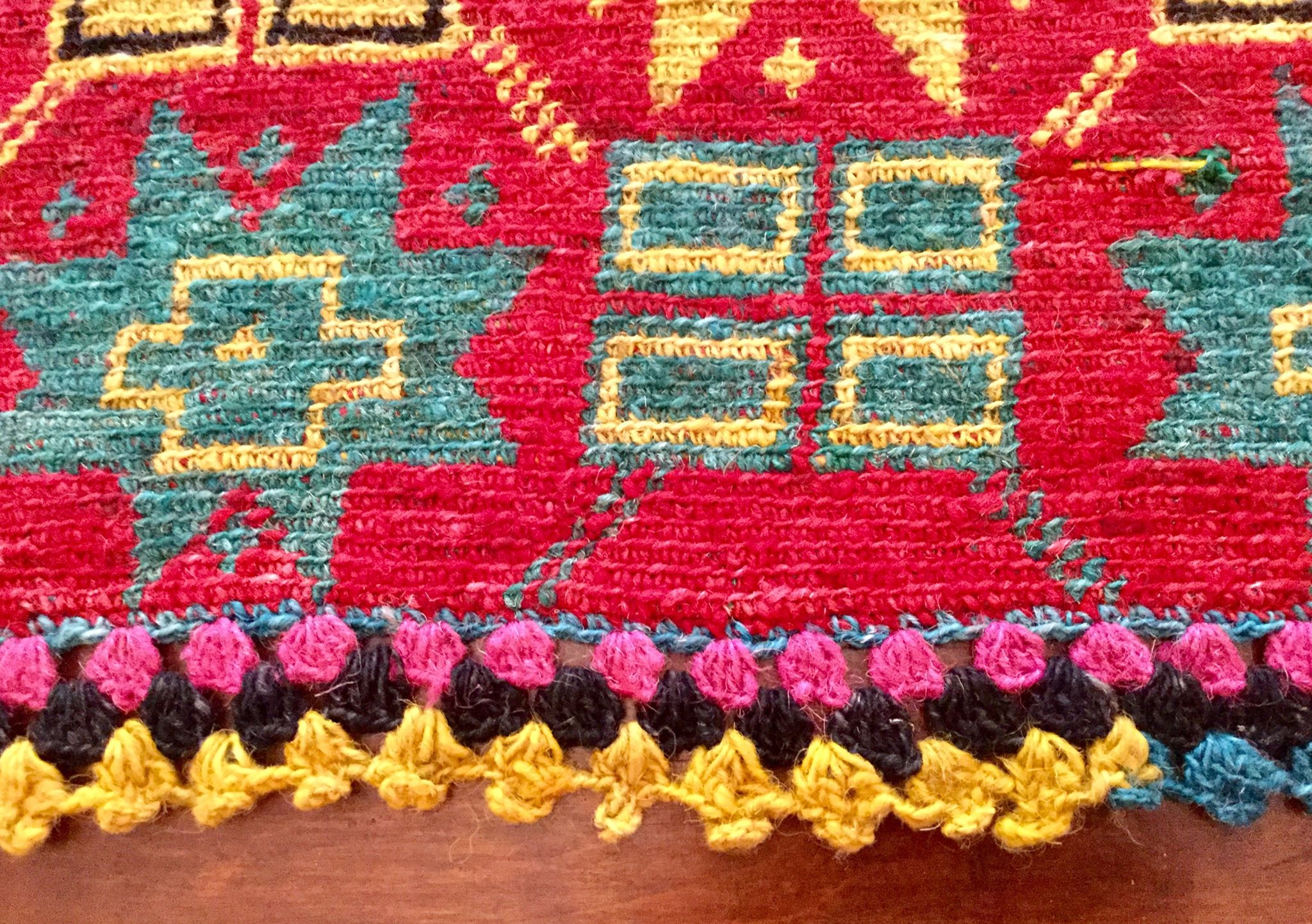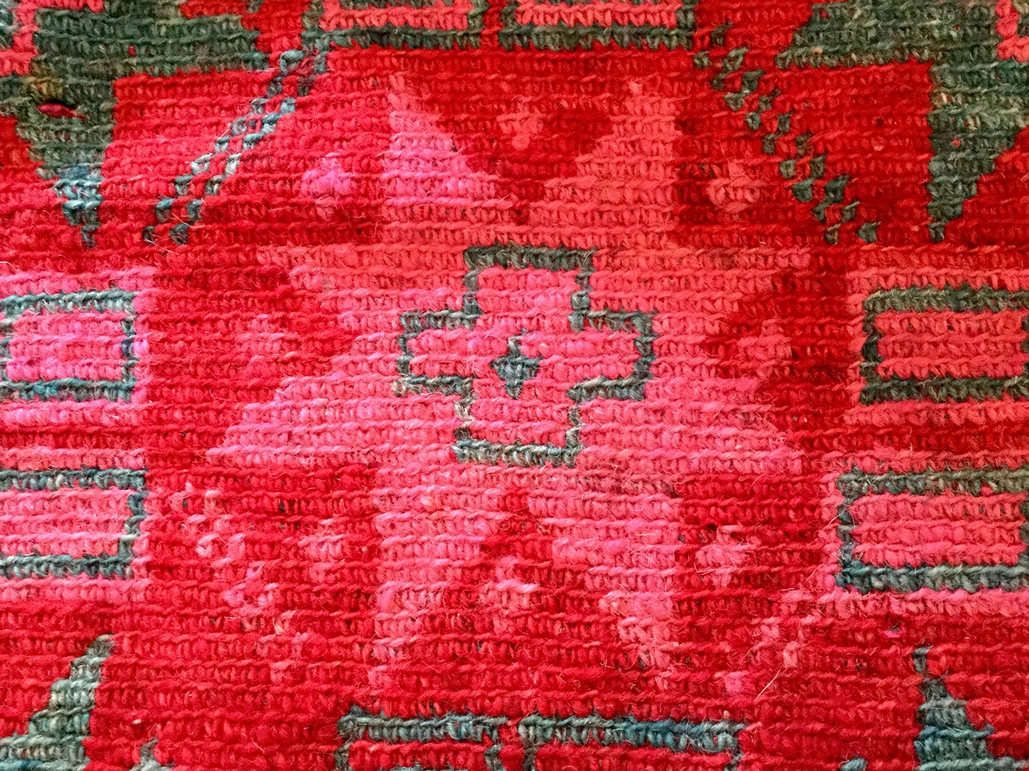 Dyed woolen square rug that was used as a decorative donkey saddle for a special event such as a wedding. 85 years old.