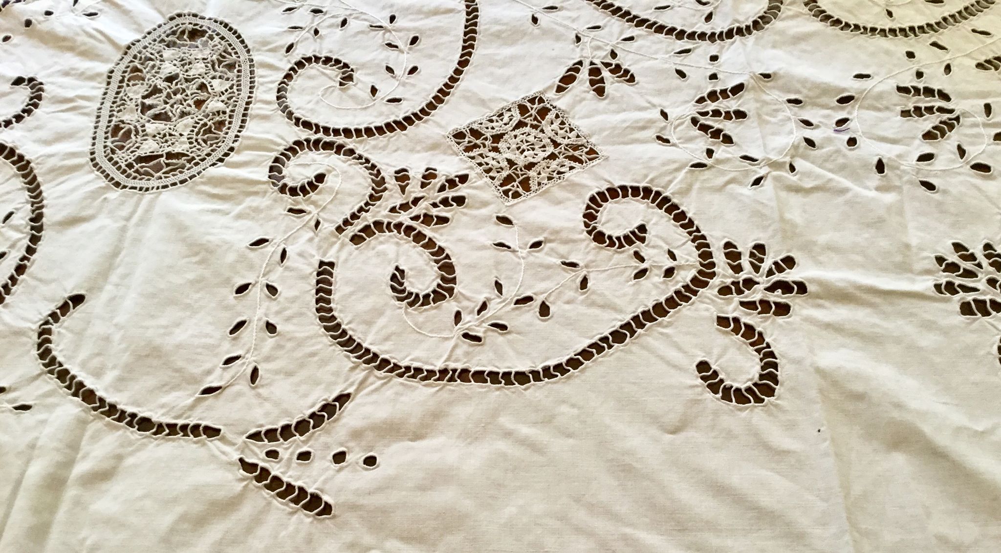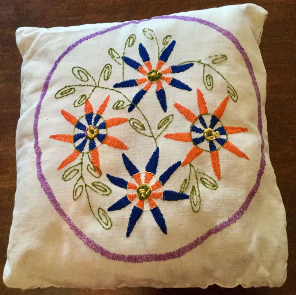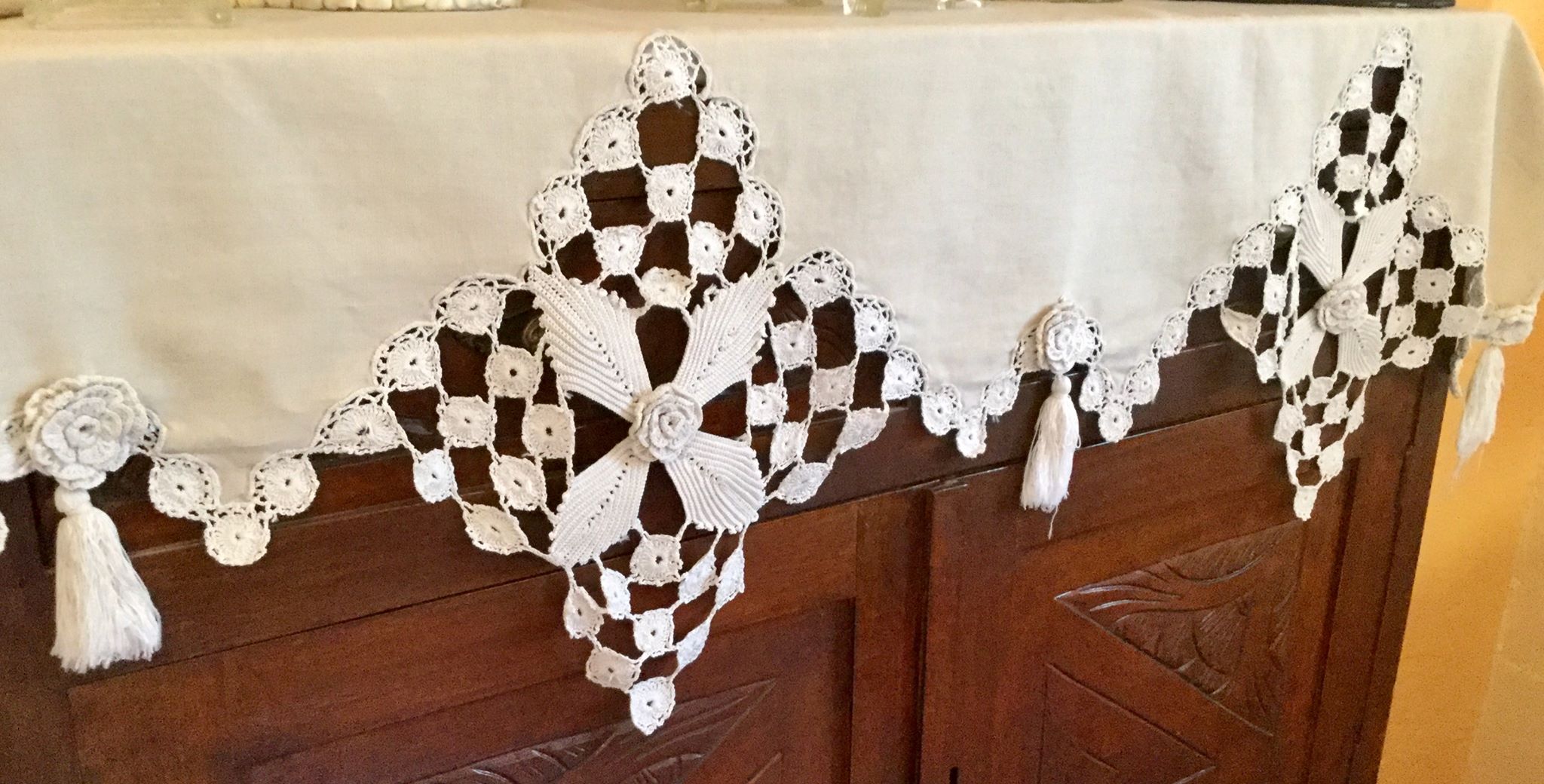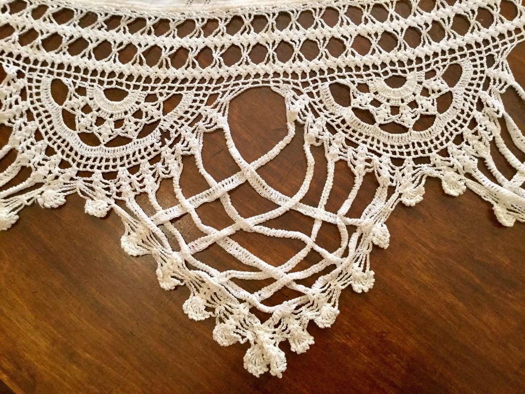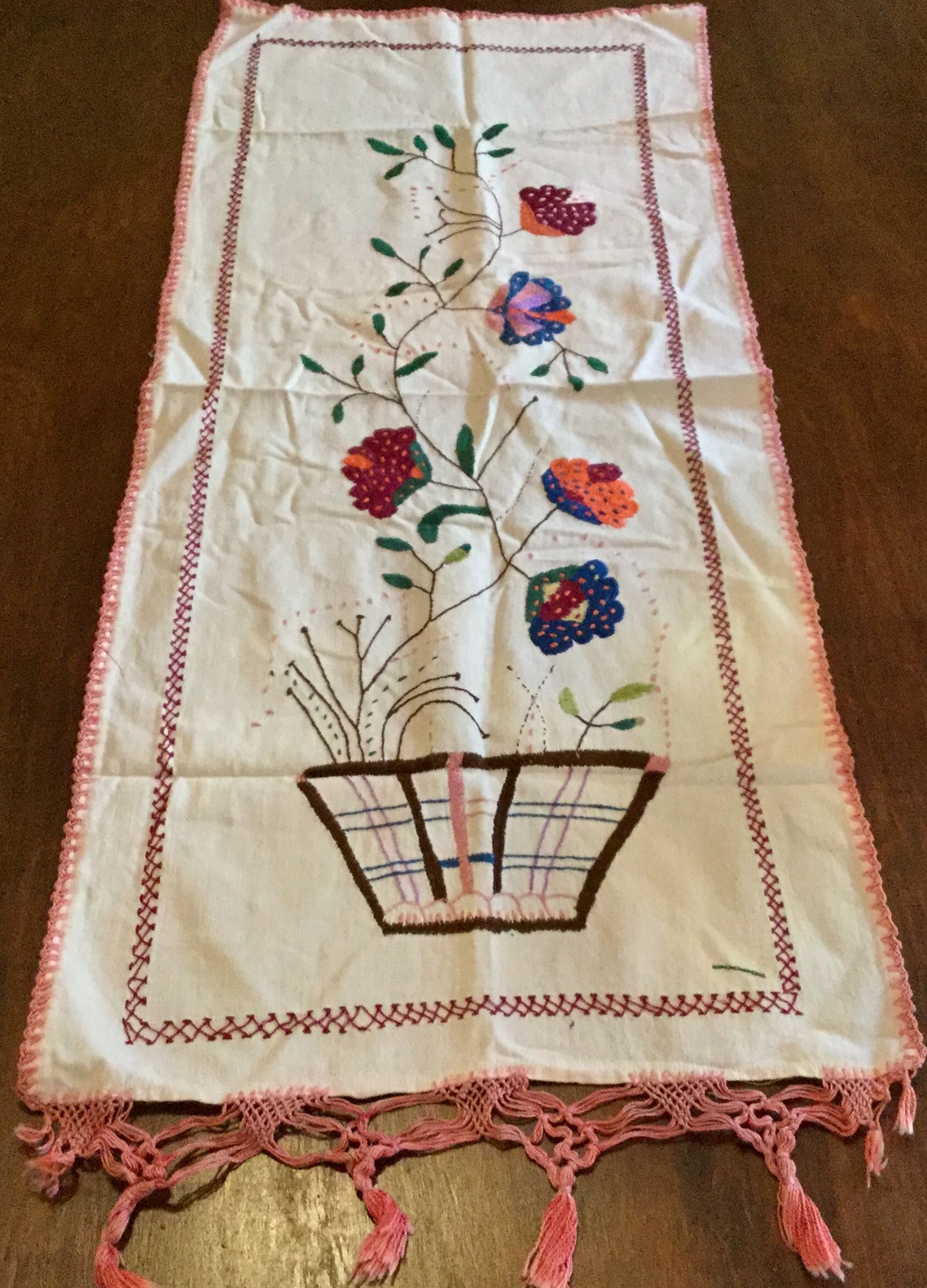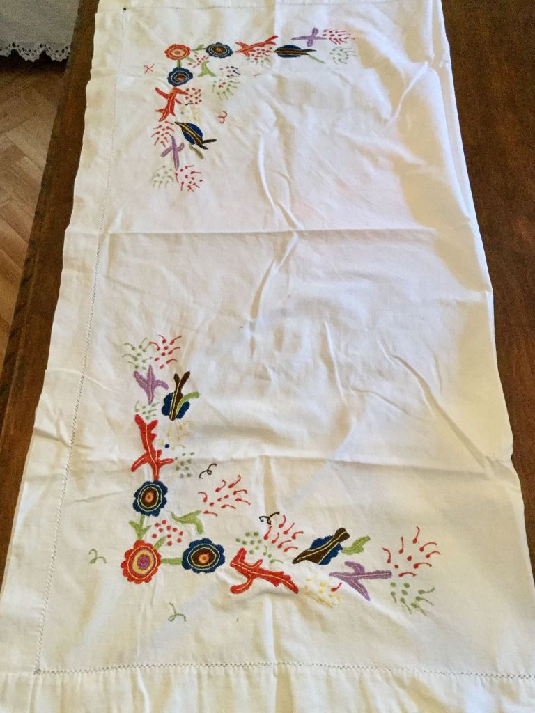 Long, decorative embroidered table runner for the corner of the formal room of the house that was in the house. 70 years old.