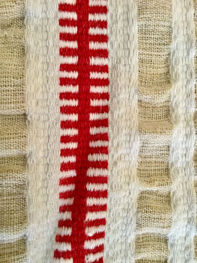 Different yarn fabrics woven on the loom with various designs and colors. About 80 years old.