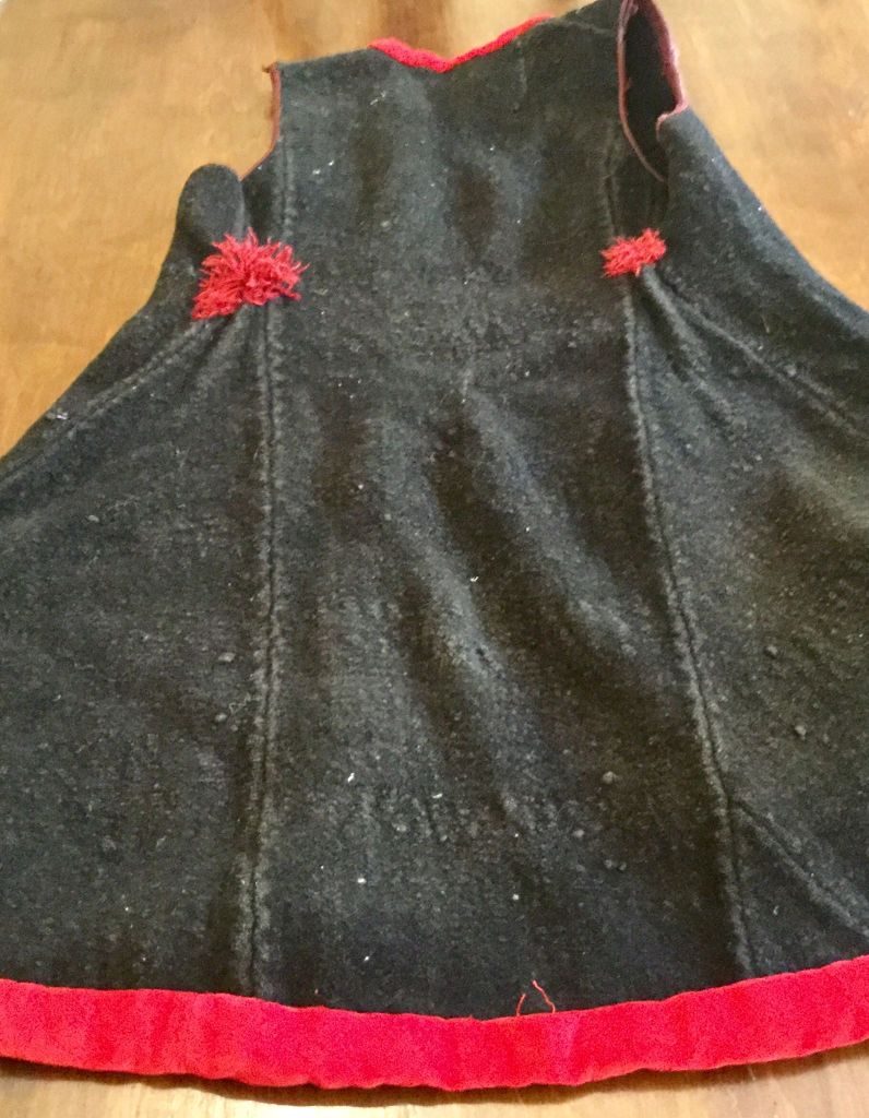 γυναικείο χειμωνιάτικο ρούχο παραδοσιακής φορεσιάς,μάλλινο ‘γιουρντα ‘ .μαύρο χρώμα με κεραμίδι διακοσμητική γριές γύρω γύρω και του φούντες μάλλινες στην πίσω πλευρά στο ύψος της μέσης 100 χρόνων. Προστέθηκε αργότερα κόκκινο σχέδιο