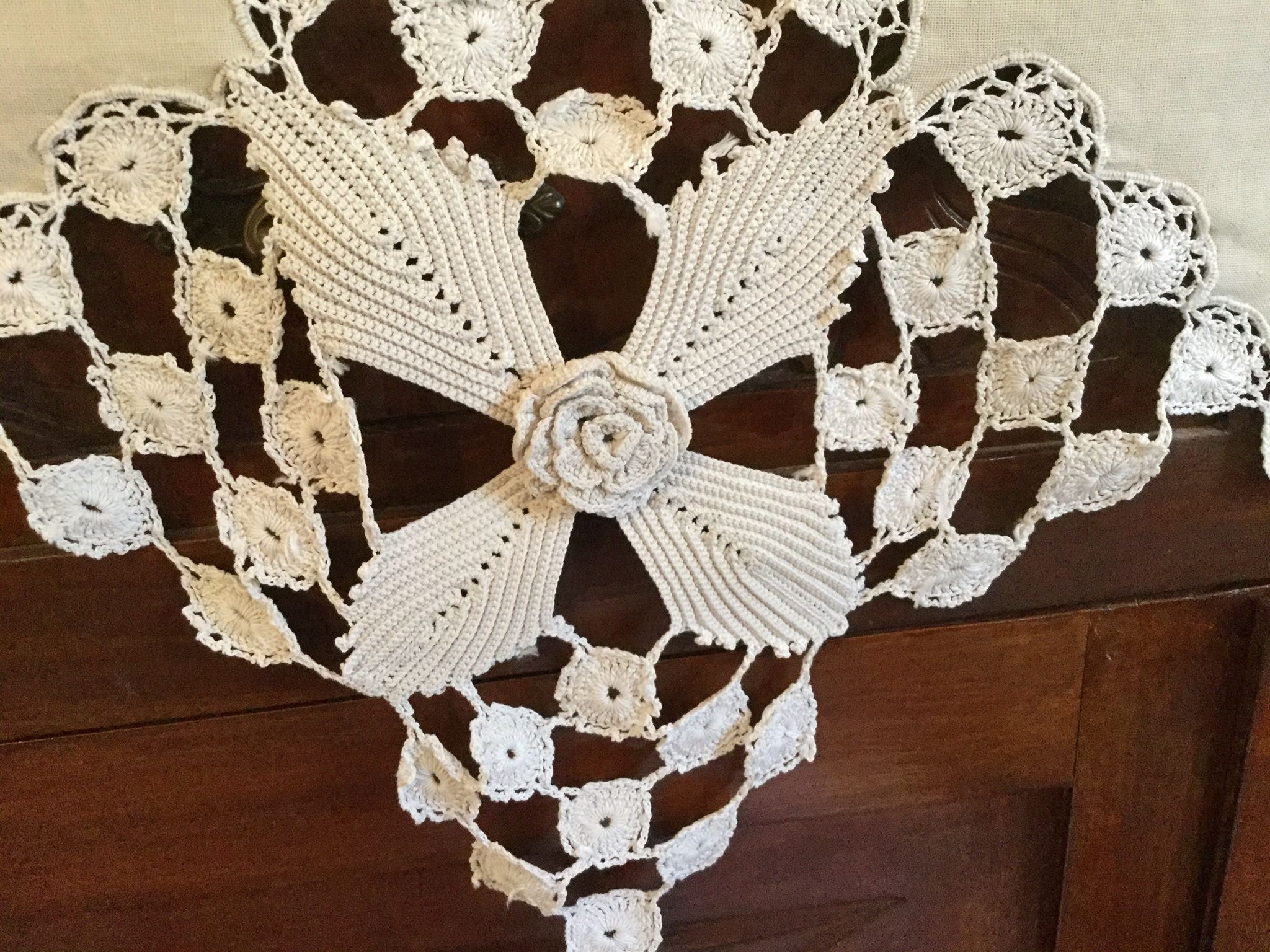 μεγάλο διακοσμητικό ‘τυπου πατανια’ κεντημένο με χοδρο βελονάκι με μάλλινο νήμα με πολλά και ιδαιτερα σχέδια και πολύχρωμη απλη δαντέλα ‘πιπιλα ‘ 90 χρόνων.