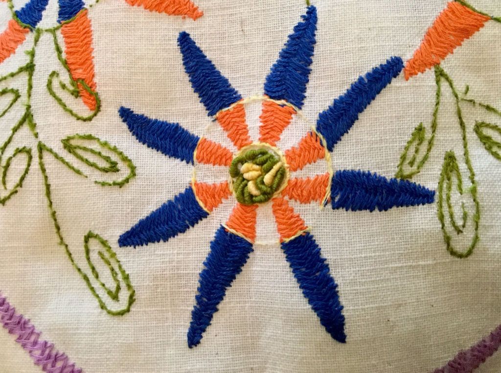 Embroidered towel on white woven fabric. 50 years old.