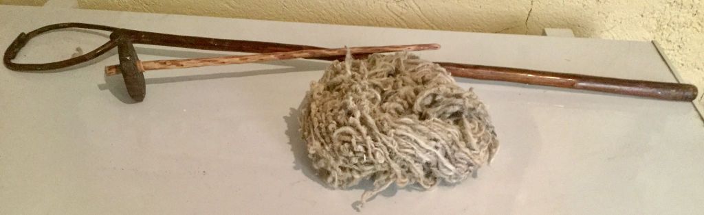 ρόκα και το αδράχτι με το σφοντυλι από το μαλλί τον προβάτων η των γιδιων επεξεργαζόταν το μαλλί και εγνεθαν ( έστριβαν με το χέρι με τρόπο ώστε να γίνει νήμα ) κουβαρι ( θηλιά ) από μαλλί προβάτου 60 χρόνων.